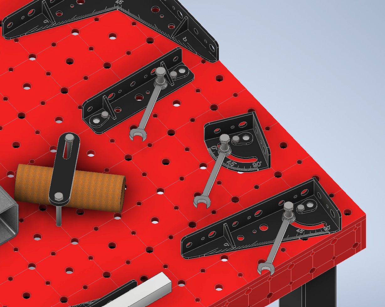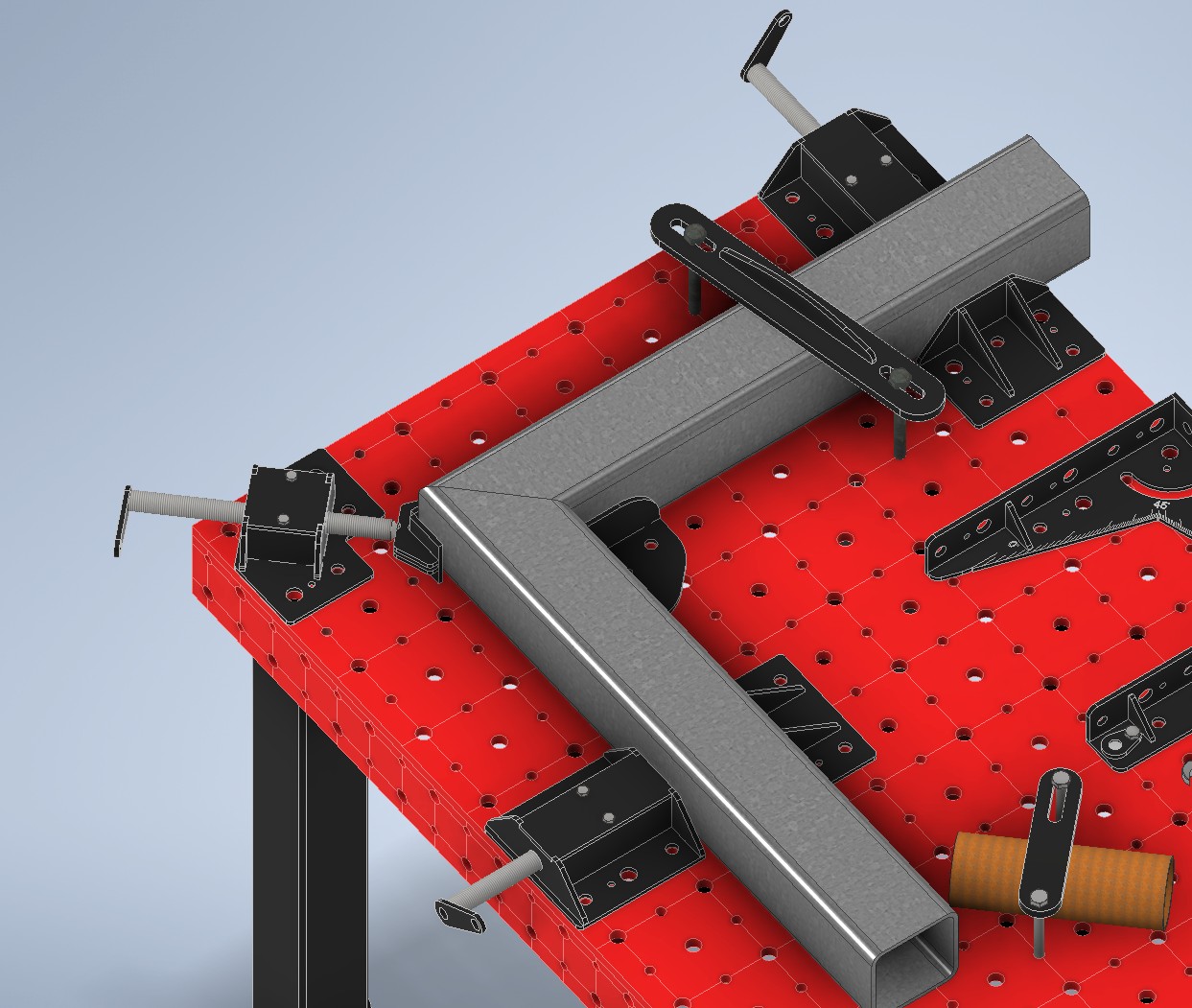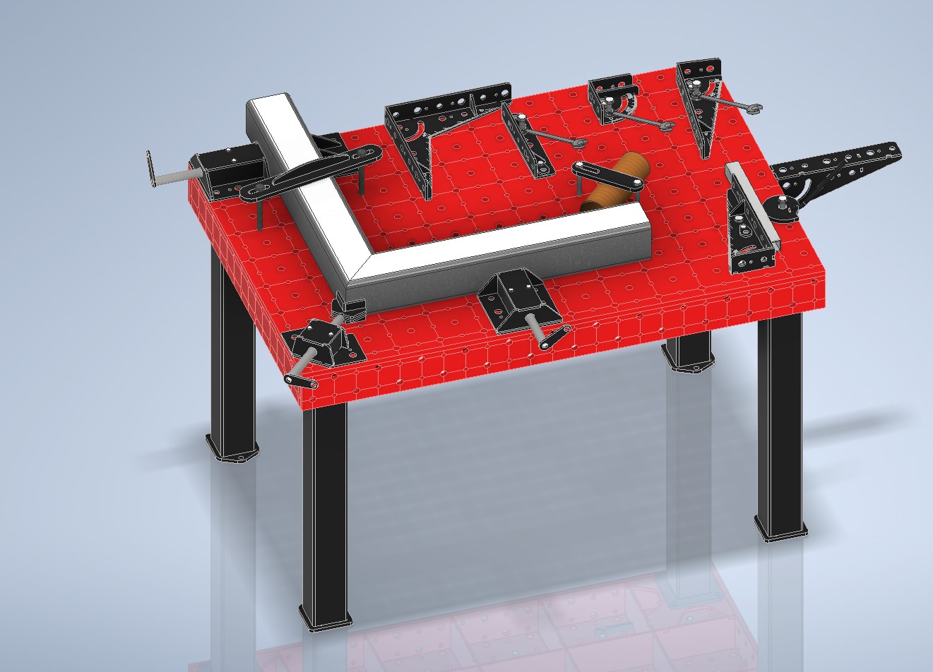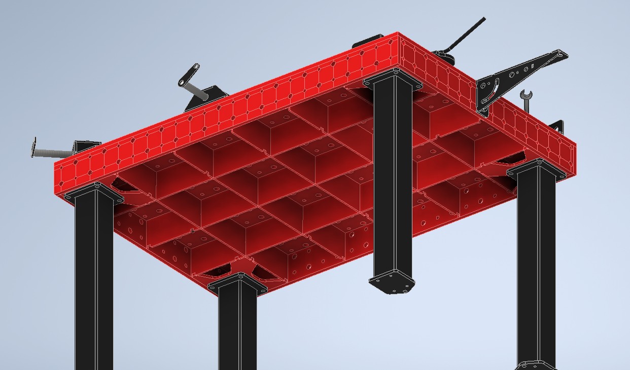 Hitsauspöydän koko (1200x800). Kansilevyvahvuus pl12mm (kansi+sivut), pl5mm (muut osat) ja RHS80x80 jalat. Massa noin 170kg. Kannessa D16mm reiät työkaluille (jako 100mm) ja M12 kierrereiät lukituksiin (jako 100mm). Kierteet kierretapilla akkuporan istukassa suoraan laserleikattuun esireikään. Kannessa merkattu mittaristikko.